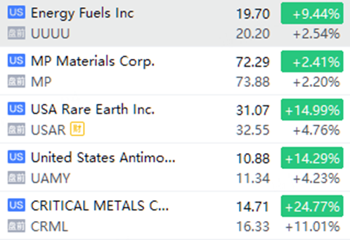 稀土概念股盤前繼續活躍,Critical Metals漲超11%,USA Rare Earth、United States Antimony漲超4%,MP Materials、Energy Fuels漲約2%。