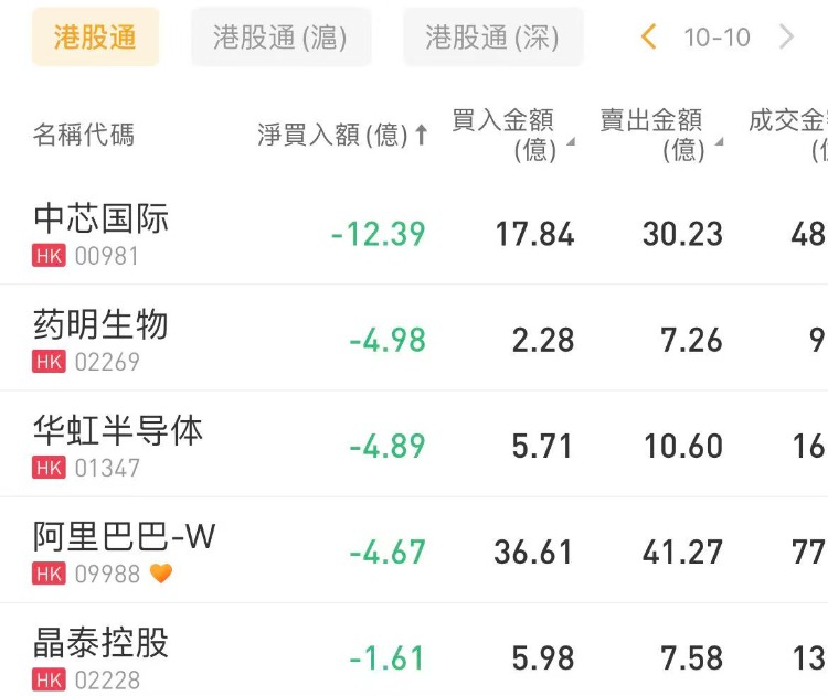 中芯國際、藥明生物、華虹半導體分別遭淨賣出12.39億港元、4.98億港元、4.89億港元。
