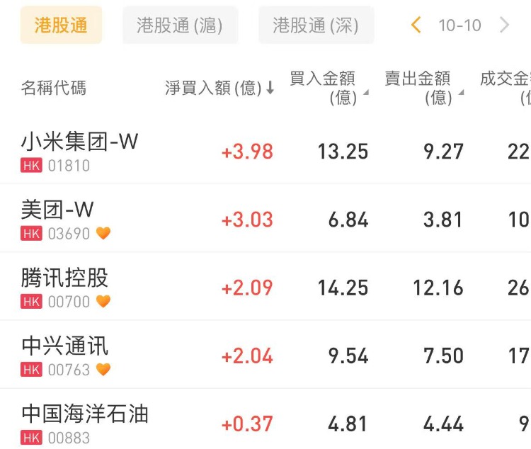 小米集團-W、美團-W、騰訊控股分別獲淨買入3.98億港元、3.03億港元、2.09億港元;