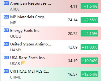 稀土概念股表現強勢,Critical Metals漲超12%,United States Antimony漲超11%,USA Rare Earth漲超10%,Energy Fuels漲超5%,MP Materials漲2%,American Resources漲超1%。