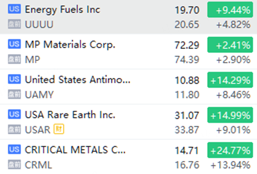 稀土概念股漲幅擴大,Critical Metals漲超13%,USA Rare Earth、United States Antimony漲約9%,Energy Fuels漲近5%,MP Materials漲近3%。