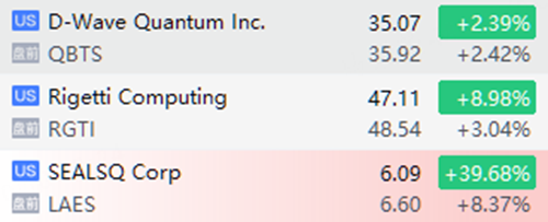 量子計算概念股活躍,SEALSQ Corp漲超8%,昨日暴漲近40%;Rigetti Computing漲超3%,D-Wave Quantum漲近3%。