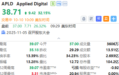 AI數據中心公司Applied Digital漲幅擴大至32%,股價創歷史新高,年內累漲逾400%,公司第一財季營收暴漲84%超預期。