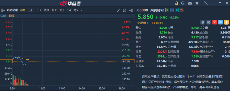 華盛資訊10月13日訊,港股蘋果概念股震盪走弱,鴻騰精密一度跌超10%,現跌約9%。