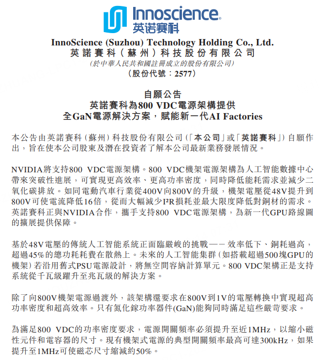 10月14日,英諾賽科公告,爲800 VDC電源架構提供全GaN電源解決方案,正與英偉達合作,攜手支持800 VDC電源架構。