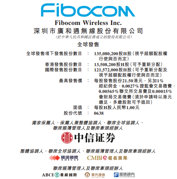 華盛資訊10月14日訊,廣和通(00638)今起招股,擬發行1.35億股H份,其中10%爲香港公開發售,其餘爲國際配售,另有15%超額配股權。