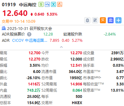 華盛資訊10月14日訊,港口運輸概念股走高,截至發稿,中遠海控漲5%,中遠海發漲近4%,東方海外國際漲近3%。