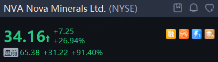 Nova Minerals Ltd. 暴漲超90%,此前宣佈從美國國防部獲得資金,用於打造關鍵礦產供應鏈。
