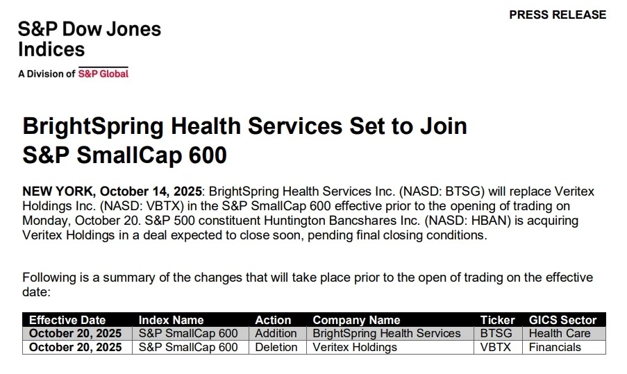 10月15日,BrightSpring Health Services盤後漲超5%!據標普道瓊斯指數官網,該公司將取代Veritex成爲標普600小型股指數成分股,生效日期爲2025年10月20日開盤前。