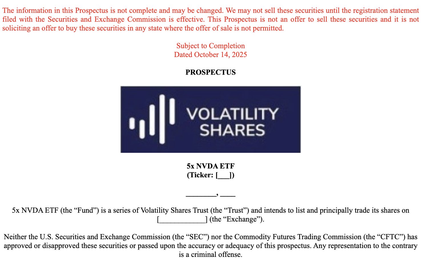 10月15日,Volatility Shares剛剛向美國證券交易委員會提交13只新的5倍單一股票ETF申請。