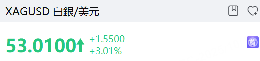現貨白銀再次站上53美元/盎司,日內漲3%。白銀概念股 泛美白銀 盤前大漲3%, 白銀ETF(iShares) 盤前漲超2%。