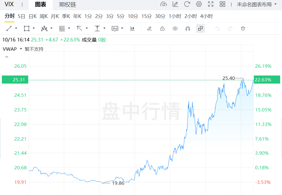 被稱爲“華爾街恐慌指數”的標普500波動率指數隔夜飆升超22%,最終收於25.31,創4月24日以來最高收盤水平。