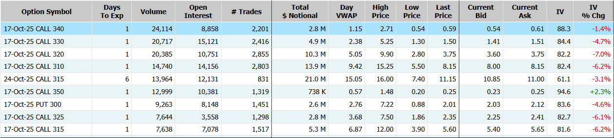 甲骨文隔夜漲超3%,期權合約成交45.53萬張,較90日均量放大1,8倍。10月17日到期的340美元的行權看漲期權交易量特別高,共有24,114份合約交易。 $ORCL 20251017 340.0 CALL$