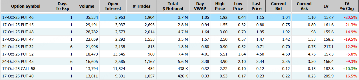 量子計算概念股Rigetti Computing隔夜跌近15%,期權合約成交56.54萬張,較90日均量放大2,2倍。10月17日到期的46美元的行權看跌期權交易量特別高,共有35,534份合約交易。 $RGTI 20251017 45.0 PUT$