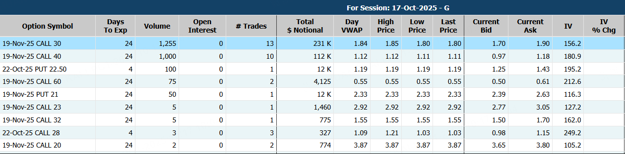 期權方面,VIX期權成交178.08萬張,其中11月19日到期、行權價30美元的看漲期權交易量尤爲活躍,共交易1,255份合約。 $VIX 20251119 30.0 CALL$