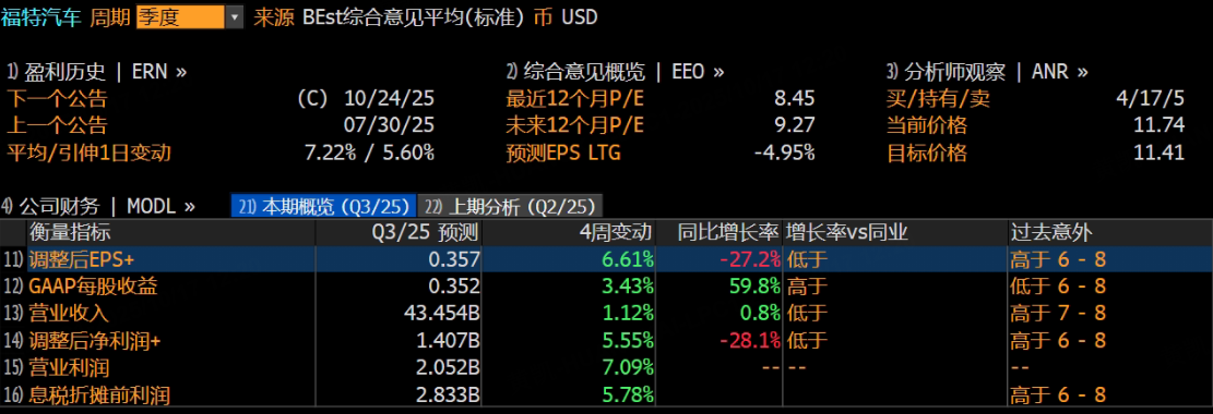 福特汽車將於2025年10月23日美東時間盤後公佈其2025財年第三季度財報。根據彭博社分析師的預測,福特第三季度的營收預計爲434.54億美元,同比增長0.82%;調整後每股收益(EPS)預計爲0.36美元,同比下降27.18%。