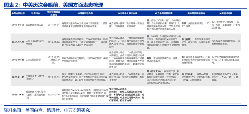 會晤前釋放強硬表態是特朗普慣用戰術策略、旨在增加談判籌碼。歷史上有四次中美元首會晤的案例,分別是2017年4月海湖莊園會晤、2018年G20會晤,2019年G20會晤,2020年一階段協議達成。2018年12月1日,中美於布宜諾斯艾利斯舉行G20會晤,特朗普於11月26日表態稱極可能將2000億清單關稅由10%調至25%,威脅對剩餘2670億美元產品加稅。會晤後,中方下調對美汽車關稅,增加農產品採購,美國方面則暫停關稅上調。特朗普一般在會前1至2周釋放強硬信號,迫使談判對手做出調整,但今年中方的應對策略與1.0並不相同。