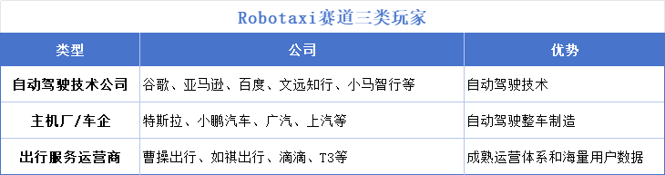 Robotaxi 的主要玩家大致分爲三類:自動駕駛技術公司、主機廠/車企和出行服務運營商。