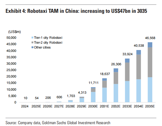 在市場規模上,高盛報告指出,更樂觀預測,2030年Robotaxi全球市場規模將超過1000億美元;中國市場規模有望從2025年的5400萬美元增長至2035年的470億美元。