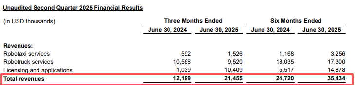 文遠知行2025年Q2總收入人民幣1.272億元,同比增長60.8%,其中Robotaxi收入同比激增836.7%至4590萬元人民幣,爲公司成立以來最高的季度自動駕駛出租車收入,佔總收入比重達36.1%。然而,2025年Q2文遠知行淨虧損人民幣4.064億元,同比小幅收窄,其研發費用人民幣3.189億元,同比增長50.5%。截至2025年6月30日,文遠知行持有現金及現金等價物及定期存款約40.88億元人民幣。