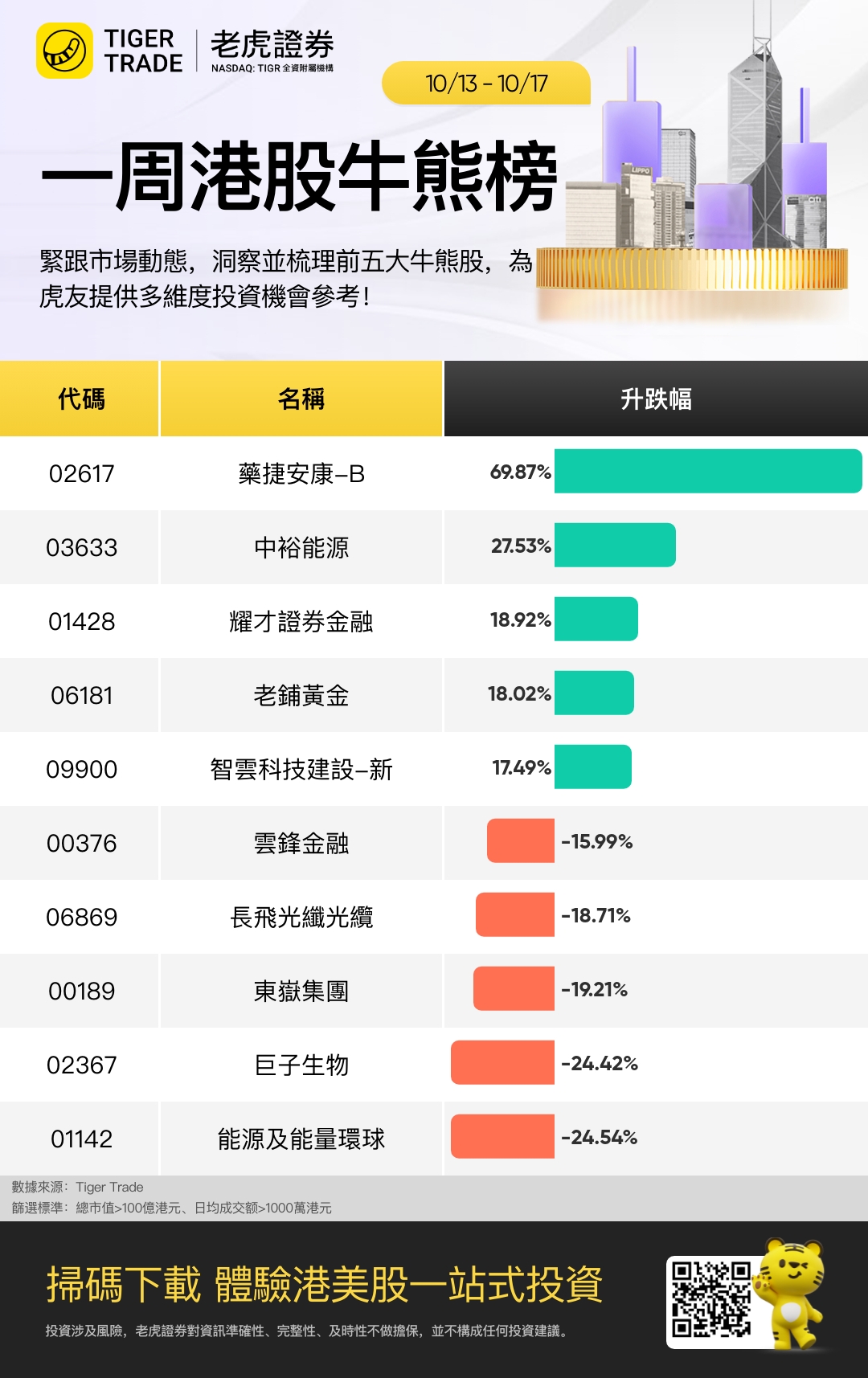 本週市值百億以上、日均成交千萬以上表現最好五隻股票是 藥捷安康-B 、 中裕能源 、 耀才證券金融 、 老鋪黃金 、 智雲科技建設-新 ;