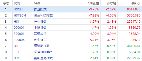 港股方面,本週恒生指數跌3.97%,報25247.10點;恒生科技指數跌7.98%,報5760.38點;國企指數跌3.70%,報9011.97點;