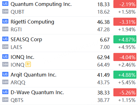 10月20日,美股夜盤時段,量子計算概念股上漲,Arqit Quantum Inc.漲超5%,SEALSQ Corp漲近5%, IONQ Inc.漲超2%,Quantum Computing Inc.、Rigetti Computing、D-Wave Quantum Inc.漲超1%。
