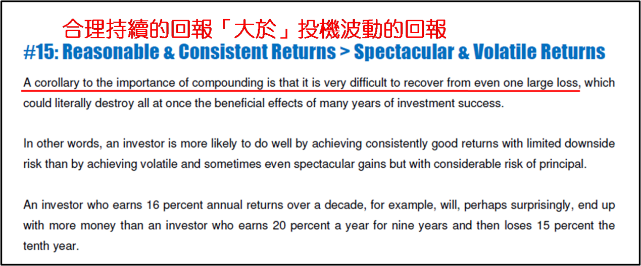 今日延續看第十五、第十六和第十七個思想,第十五是“合理持續的回報『大於』投機波動的回報”,賽思·卡拉曼 (Seth Klarman) 指出投資生涯是漫長的,所以要牢記複利效應的一個必然事實,只要出現一次慘重損失,足以毀掉你過去多年成功的投資成果。換言之,從長遠績效而言,奉行價格下行風險,但能產生持續回報,或許表現並不顯着的投資原則,勝於不斷買入潛在回報令人心動,卻要承受價格波動,並隨時錄得重大虧損的股份。例如,若每年回報率爲10%,十年後的累計回報便接近1.6倍;即或另一股份能產生每年回報率達20%,較前者多出一倍,就算前九年均錄得回報,卻不幸地第十年虧損五成或以上,那麼最終回報便不及前者的。