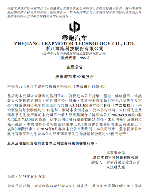零跑汽車港交所公告,董事長兼首席執行官朱江明及公司股東傅利泉於市場內合共購入3,243,500股本公司H股,平均價格爲每股股份約63.19港幣。緊隨本次增持後,於本公告日期,朱江明先生及傅利泉先生及所屬的本公司單一最大股東集團合共持有本公司206,949,938股H股及128,517,839股內資股,佔本公司已發行總股數的23.59%。