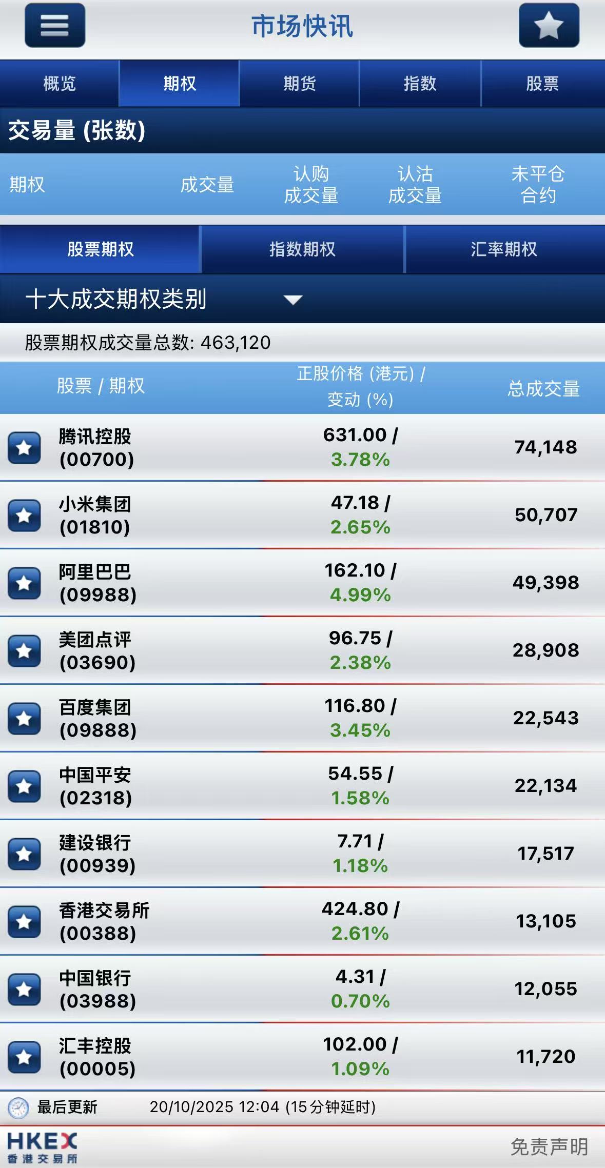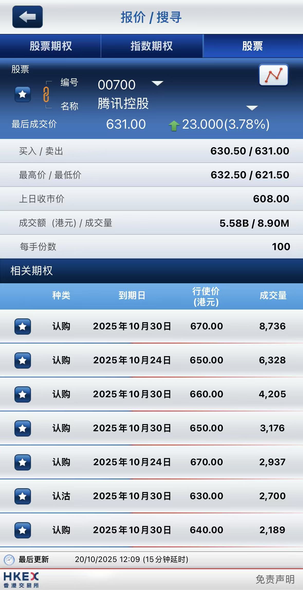 期權方面,騰訊控股期權半日成交7.42萬張,其中於10月30日到期670港元行使價的認購期權成交居前,成交超8700張;