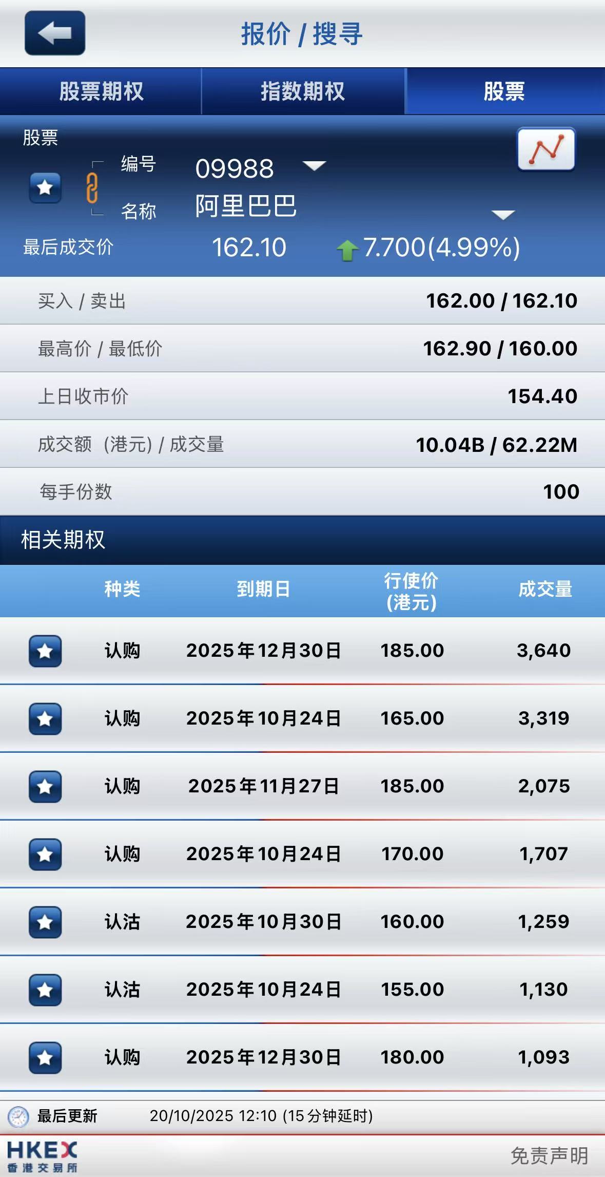 阿里巴巴-W期權半日成交4.94萬張,其中於12月30日到期185港元行使價的認購期權成交居前,成交超3600張;