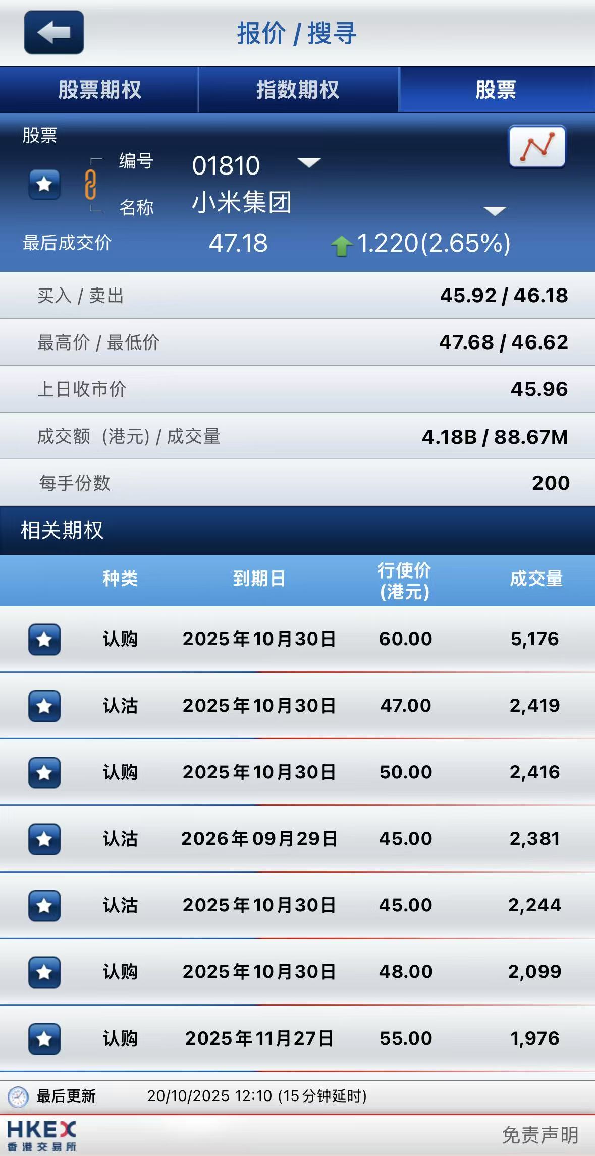 小米集團-W期權半日成交7.42萬張,其中於10月30日到期60港元行使價的認購期權成交居前,成交超5100張;