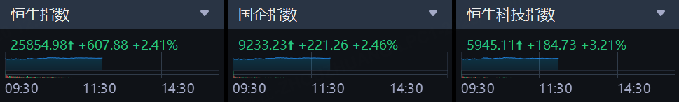 10月20日,港股上午盤三大指數高開震盪,市場情緒回暖,止步連跌行情。截止午盤,恒生科技指數一度漲至3.9%,午間收漲3.21%,恒生指數、國企指數分別上漲2.41%及2.46%,恒指上揚超600點報25855點。