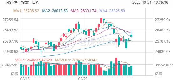 10月21日,港股三大指數午後漲幅稍有收窄,總體仍維持上漲格局,同時延續昨日反彈行情,市場情緒持續回暖。截止收盤,恒生指數漲0.65%重回26000點上方,國企指數漲0.76%,恒生科技指數漲1.26%報6007點。