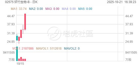 次新股軒竹生物-B飆漲近34%,股價創上市以來新高;