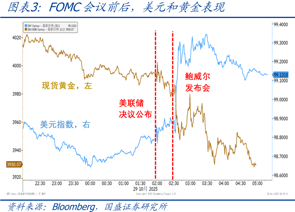 >資產價格表現:會議過後,美股和黃金走低,美債收益率和美元指數走高。截至10/30收盤,標普500指數收平,納斯達克指數上漲0.6%,道瓊斯指數下跌0.2%;10Y美債收益率上行9.8bp至4.07%,美元指數上漲0.4%至99.16,現貨黃金下跌0.6%至3929.7美元/盎司。