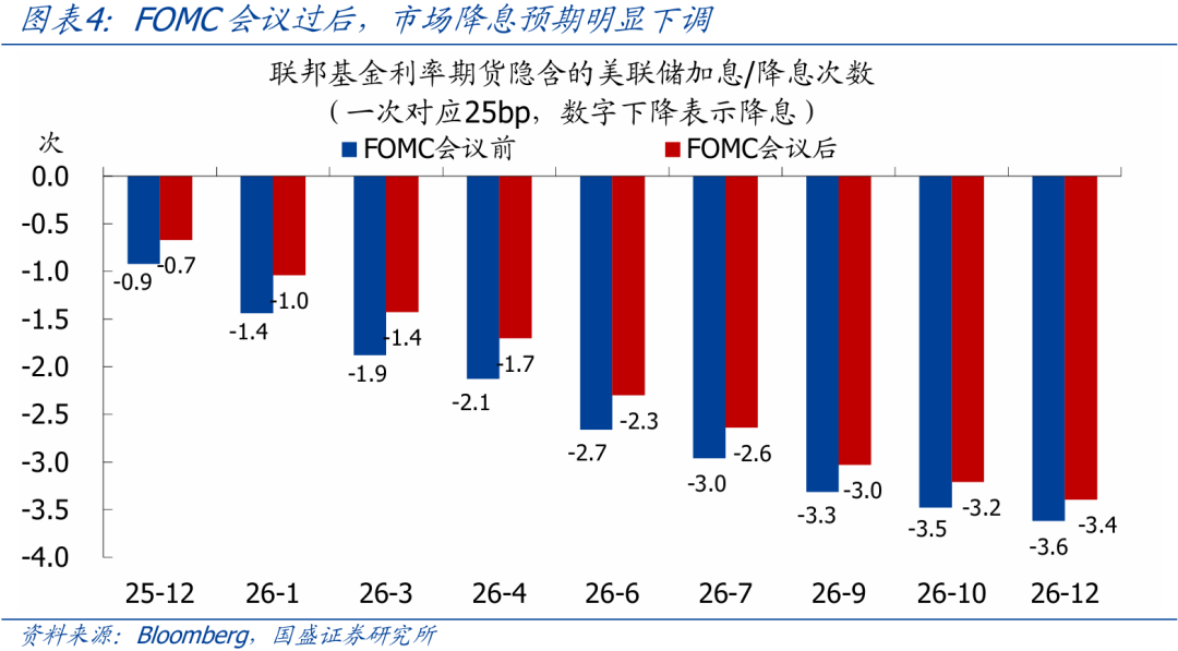>降息預期變化:會議過後,市場對美聯儲降息的預期明顯下調。利率期貨隱含的12月降息概率從超過90%降至不足70%,2026年底前剩餘降息次數從3.6次降至3.4次。