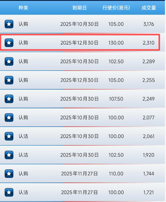 期權方面,美團上午認購合約非常活躍,在前十大成交中佔據七席。其中一份今日到期的CALL,行權價130港元。