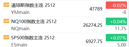 10月30日,美股三大股指期貨漲跌不一,截止發稿,道指期貨跌0.02%,納指期貨漲0.04%,標普500指數期貨漲0.07%。