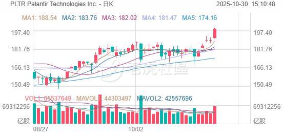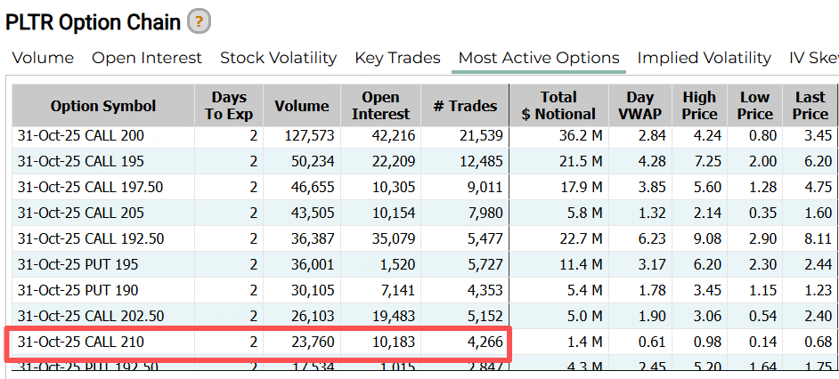 週三Palantir期權合約成交量達105萬份,較前一交易日增長102%。看漲期權佔期權總交易量的68%。當日成交量前十的合約中,CALL佔比更高,其中一份週五到期的認購合約,行權價達210美元。