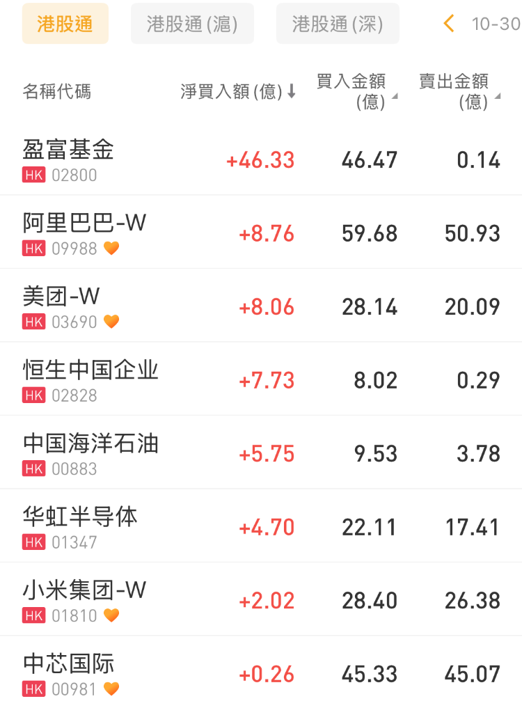 盈富基金、阿里巴巴-W、美團-W分別獲淨買入46.33億港元、8.76億港元、8.06億港元;