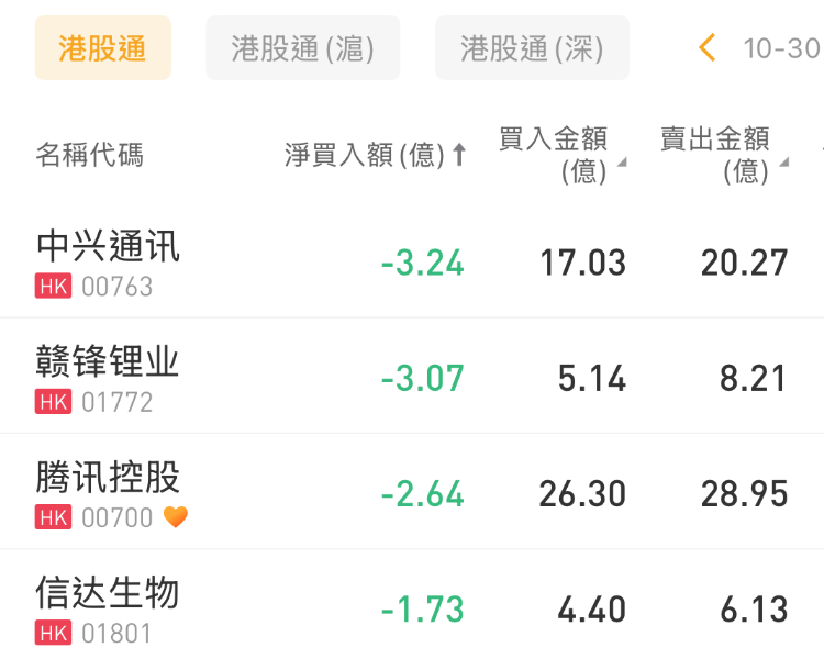 中興通訊、贛鋒鋰業、騰訊控股分別遭淨賣出3.24億港元、3.07億港元、2.64億港元。