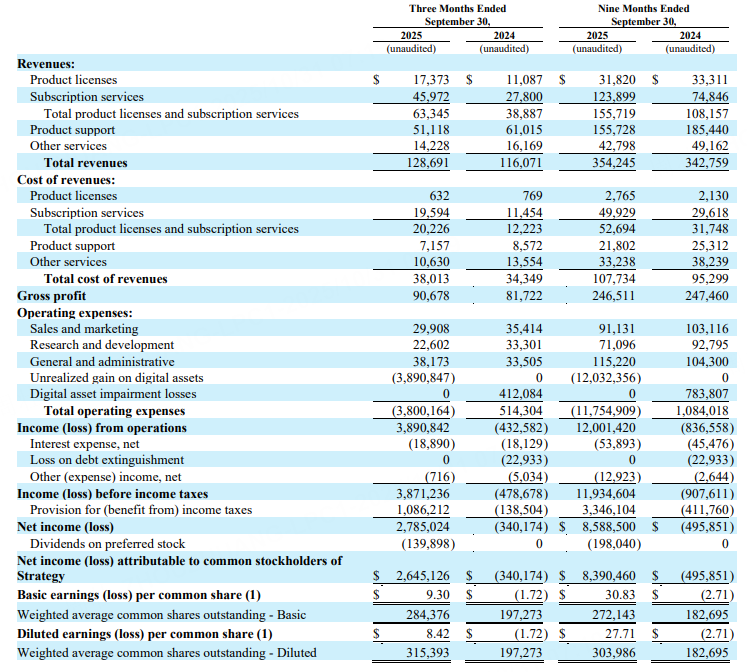 該公司表示,預計將通過優先股發行、以市場淨資產值 (mNAV) 爲指導的有紀律的普通股發行以及持續擴大比特幣持有量來實現這些目標,從而強化其以數字資產積累爲中心的長期戰略。於10月30日股市收盤後發佈了第三季度財報 ,淨利潤飆升至28億美元。其稀釋後每股收益(EPS)爲8.42美元,超過分析師預期的8.15美元。