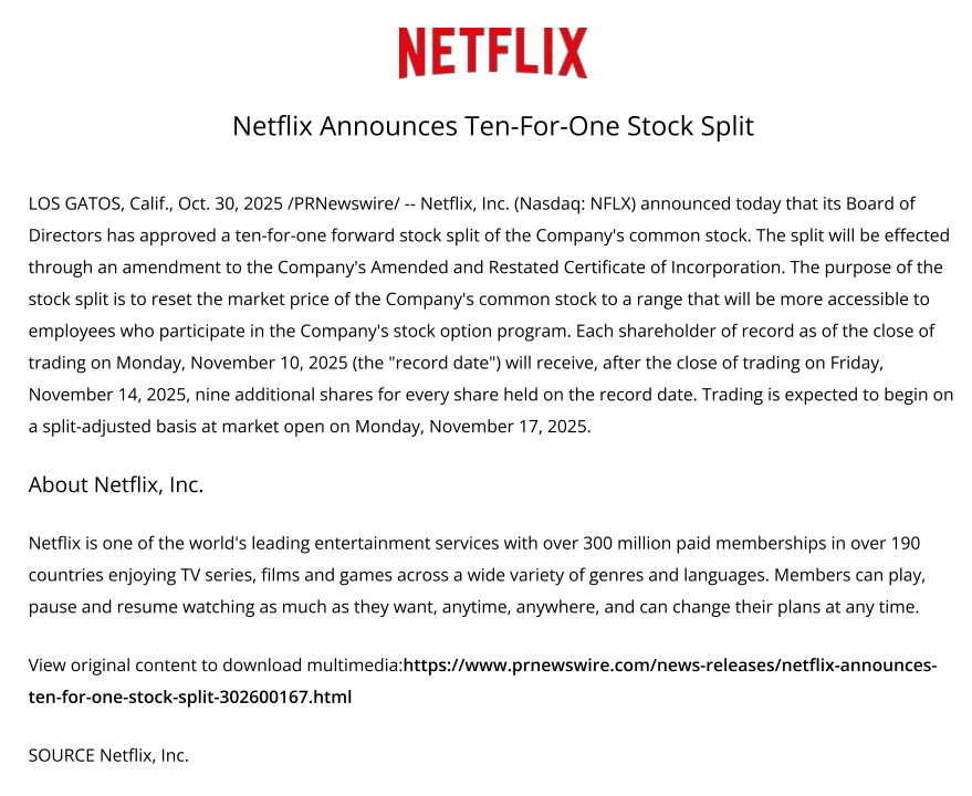 10月31日,奈飛美股盤後漲超3%,此前公司宣佈1拆10的股票拆分計劃。