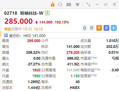 華盛資訊10月31日訊,港股明略科技-W正在暗盤交易中,截至發稿漲102.13%,報285港元/股,中籤一手賬面浮盈5760港元,最新總市值超400億港元。該股預計將於11月3日正式掛牌上市,配售結果將於今日晚間披露。