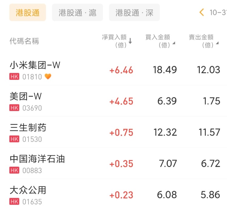 小米集團-W、美團-W、三生製藥分別獲淨買入6.46億港元、4.65億港元、7,546萬港元;