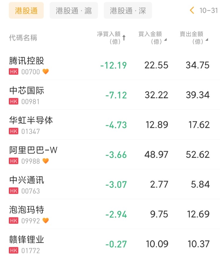 騰訊控股、中芯國際、華虹半導體分別遭淨賣出12.19億港元、7.12億港元、4.73億港元。