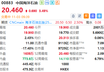 華盛資訊11月03日訊,港股石油概念股盤初走高,中國海洋石油、中國石油股份漲超3%,中國石油化工股份漲近1%。