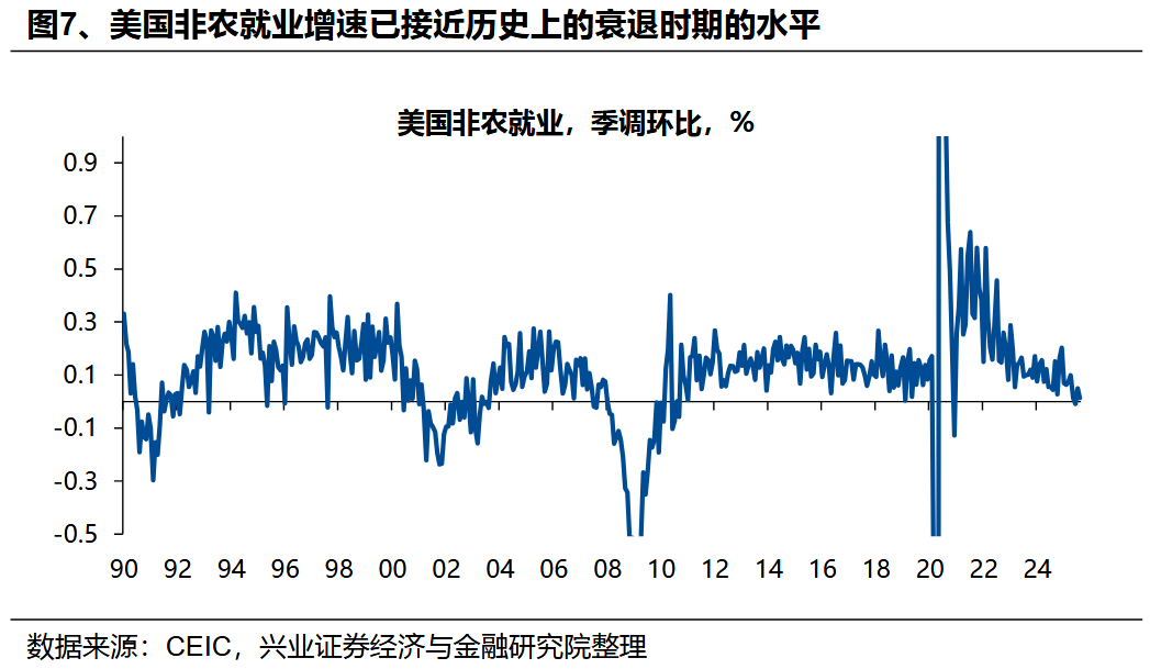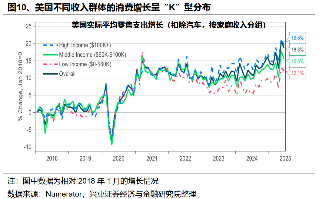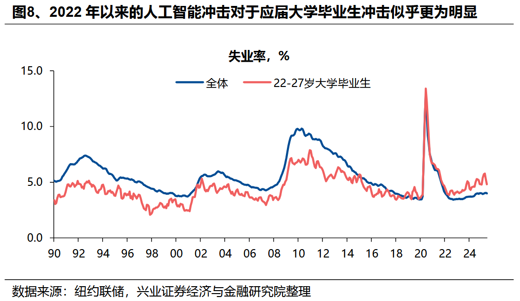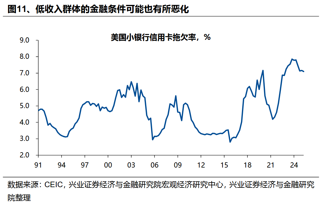 因而,自2022年底以來,美國就業市場指標與資本市場表現或整體經濟表現出現背離——就業指標“衰退”與資本市場“繁榮”並存。由於AI企業“重資本輕人力”的特徵,自2022年ChatGPT面世以來,儘管其通過前述企業盈利增長、資本開支擴張帶動美國資本市場及GDP的增長,但其對就業市場的拉動作用非常有限。兩個典型的指標,一是美國職位空缺率(招工率)快速下行,當前下行的時長甚至已超過過去幾輪經濟危機時期;二是非農就業環比增速已降至0附近,這也是以往在其他經濟指標仍保持韌性的環境下罕見的情況。甚至,AI產業可能正在導致部分特定領域的就業面臨“被替代”的風險。自2022年底以來,美國新大學畢業生的失業率上升較快,且高於整體的失業率水平,這與以往經濟週期呈現的規律存在顯著差異。這一現象一方面可能源於整體招工需求持續大幅下滑,另一方面或與AI可替代工種的覆蓋人羣相關——此類工種多對應需從事一定初級腦力活動的羣體,而應屆畢業生恰好是該羣體的重要組成部分。此外,從行業維度觀察,部分應用具備替代功能的AI技術的行業,如電話呼叫中心、編程等領域,也出現了就業增長放緩的情況。AI對低收入羣體就業的負面影響也反映在其他經濟指標上——低收入羣體消費不振、金融條件惡化。根據Numerator的調查數據,自2022年底以來,美國不同收入羣體的實際零售支出出現明顯的“K型”分佈,高收入羣體消費支出明顯,但低收入羣體在聯儲降息前增長明顯停滯。這一分化也體現在這部分羣體的金融條件上,美國小銀行信用卡拖欠率明顯上升,從2021年中低點4.2%一度上升至7.9%,反映底層民衆財務壓力持續累積。風險提示:國內外經濟金融不確定性,全球地緣政治形勢超預期變化。