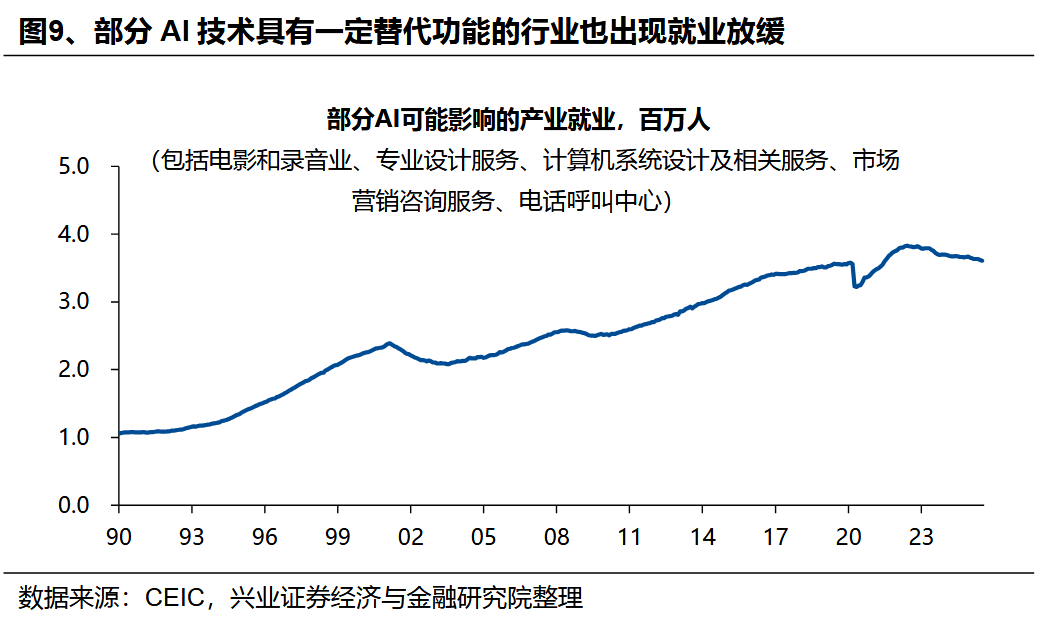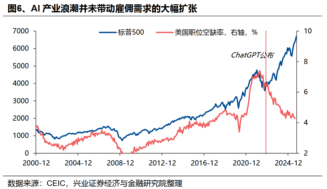 AI行業的高技術高資本投入特徵顯著,低就業吸納能力或推動收入差距擴大。作爲高技術行業,AI產業資本密集型屬性抑制了整體就業創造能力。以美股“六姐妹”爲例,其市值、利潤在標普500上市企業中佔比均超過1/4,但其僱員比例僅爲8.1%。而且,由於AI產業的高技術特徵,其所能帶動的就業或薪酬的增長往往集中於高收入人羣。
